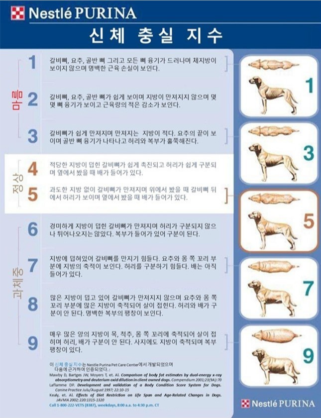 - 신체 상태 점수 (BCS): 신체 상태 점수는 강아지의 체지방률을 평가하는 방법입니다. 1에서 9까지의 점수로 평가되며, 4~5가 정상 범위, 6 이상이 비만으로 간주됩니다.