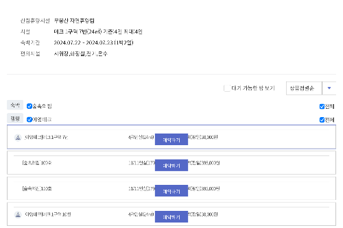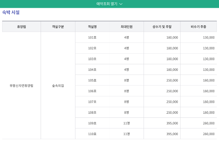 3. 시설 선택: 이용하고자 하는 숙박 시설을 선택합니다. (숲속의 집, 오두막, 야영장 등)