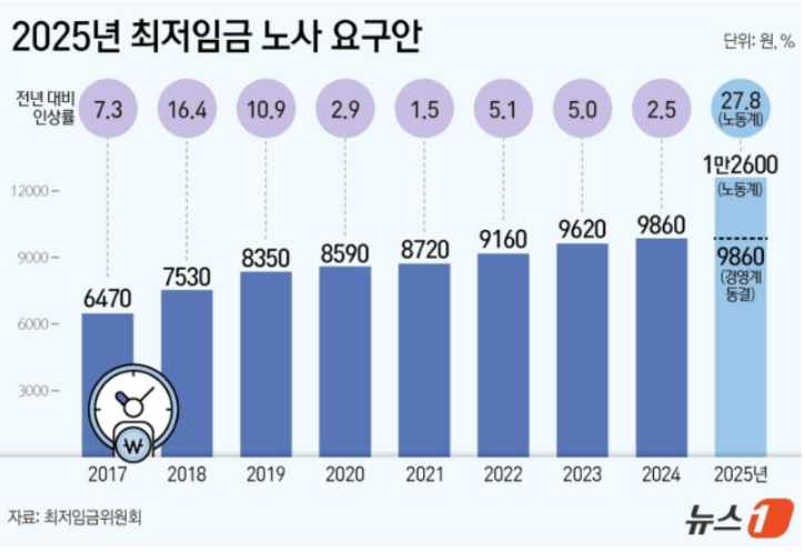 이번 인상률은 1.7%로 역대 두 번째로 낮은 수준입니다. 2021년 최저임금 인상률 1.5% 이후 두 번째로 낮은 수치로, 노동계와 경영계의 팽팽한 신경전이 반영된 결과입니다. 노동계는 물가 상승에 따른 실질 임금 하락을 이유로 인상을 요구했으나, 경영계는 노동생산성 저하를 이유로 동결을 주장해왔습니다.